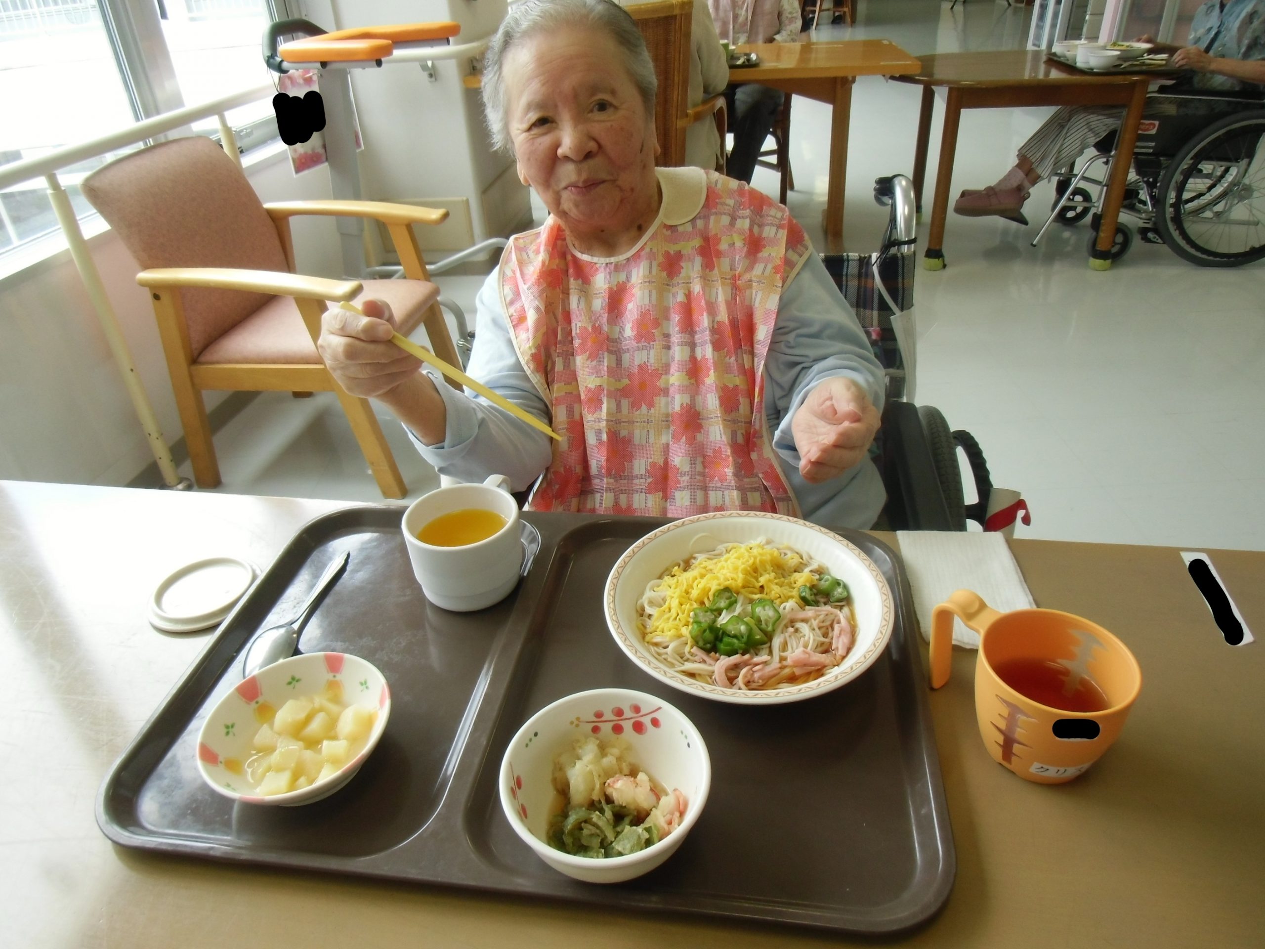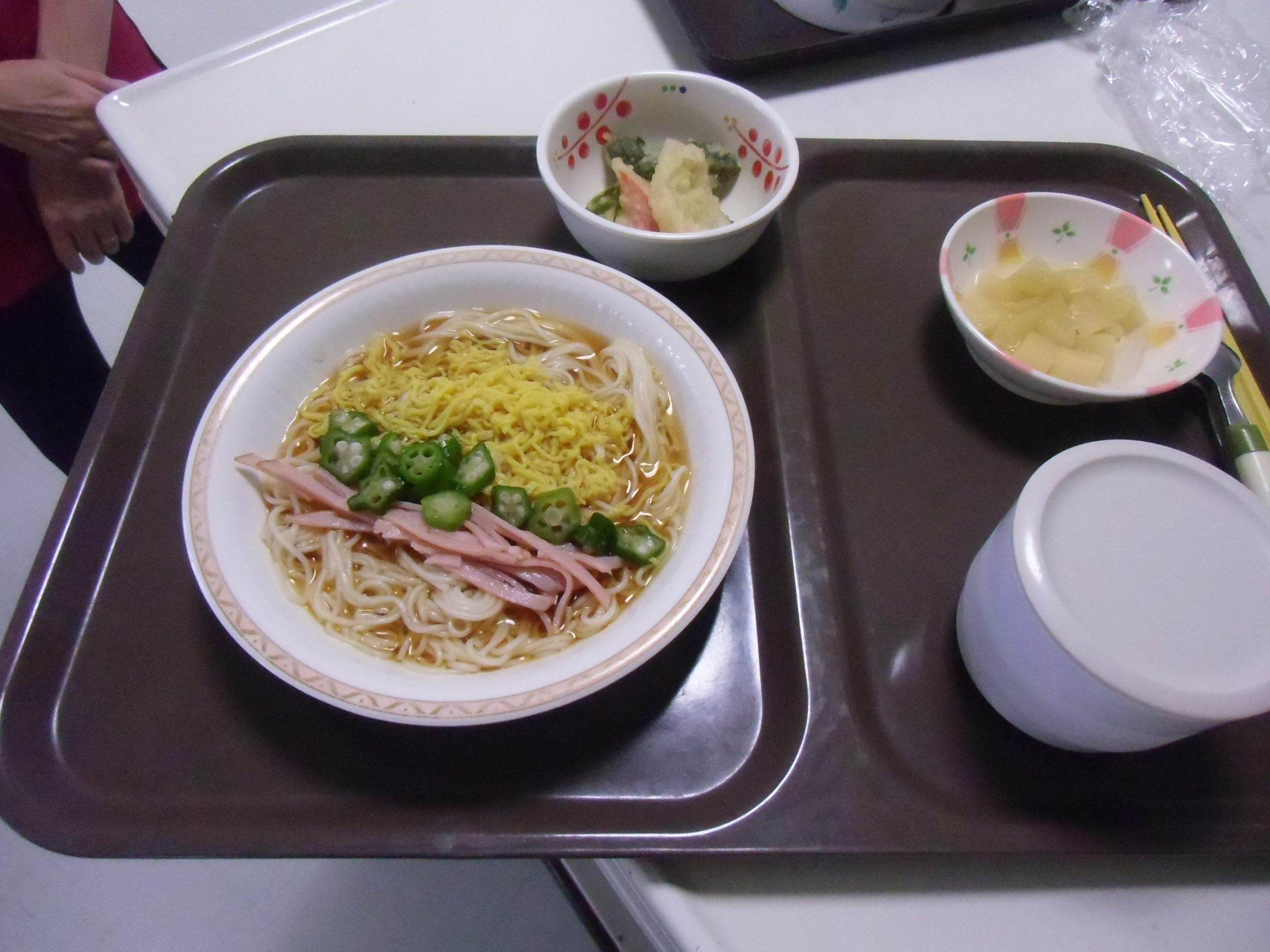 「七夕そうめん」です(^^♪ かわいいお星さまの正体は「オクラ」です。皆さん「きれいだね」「おいしいね」と自然と笑顔になっていました♪