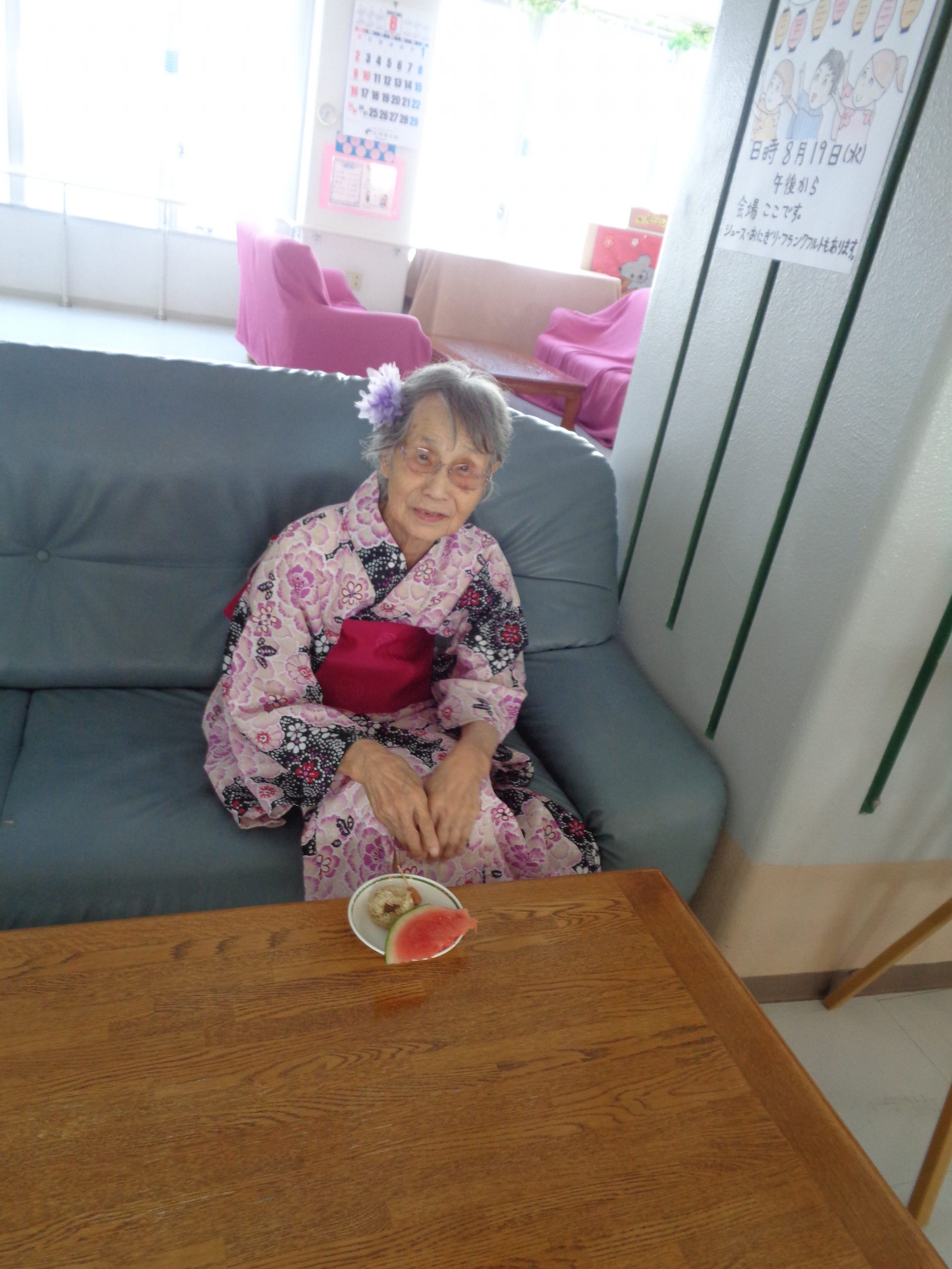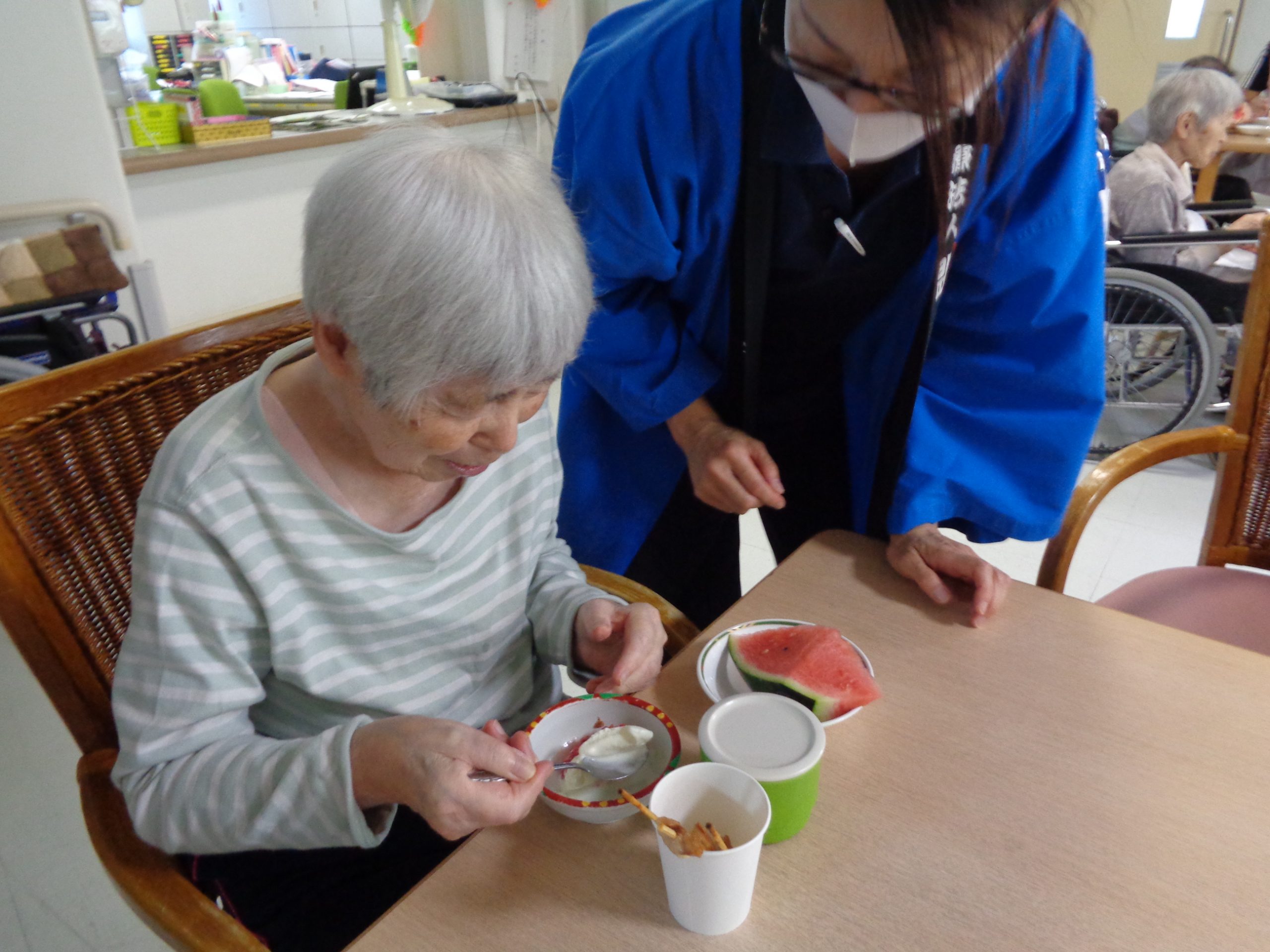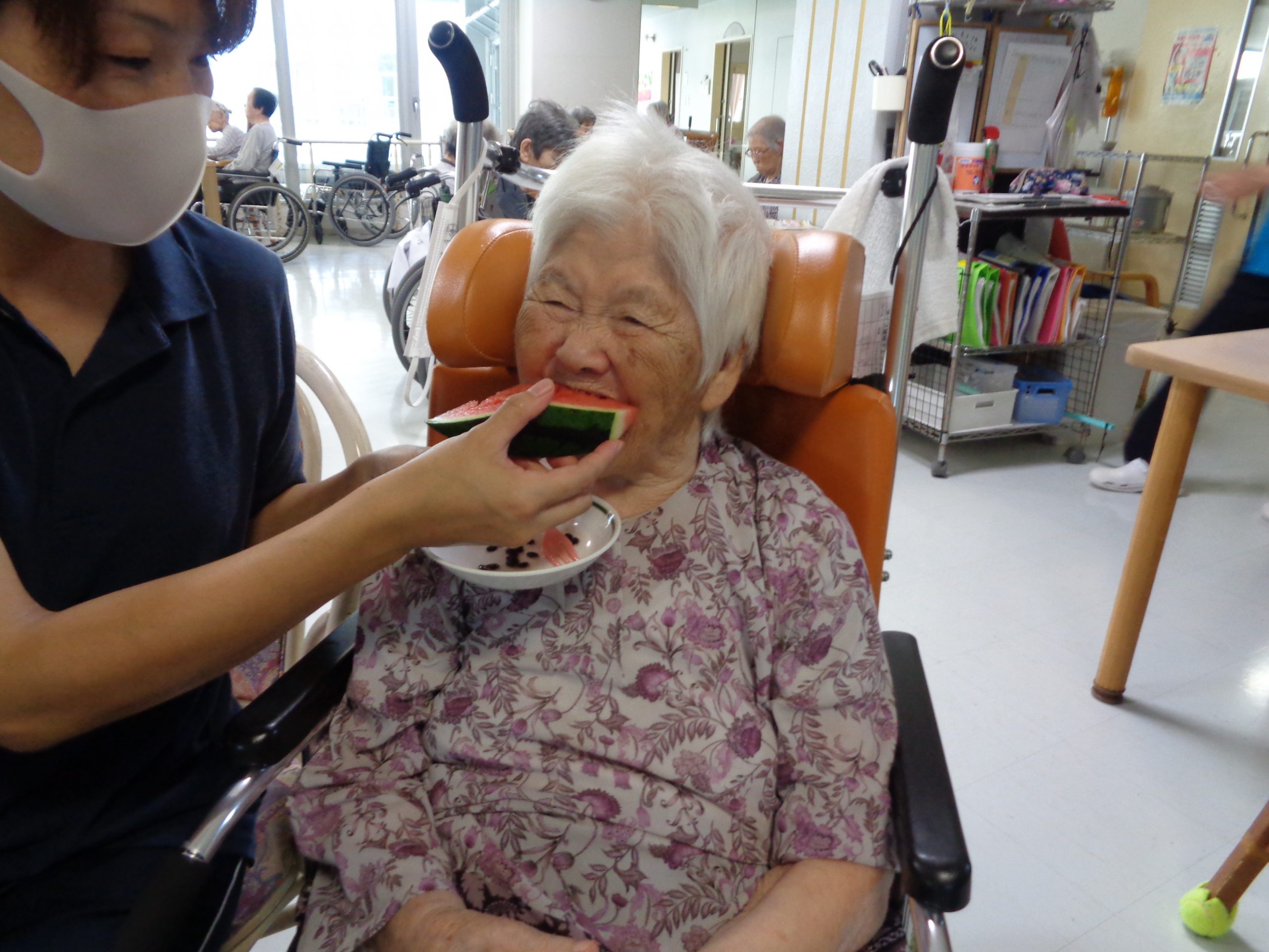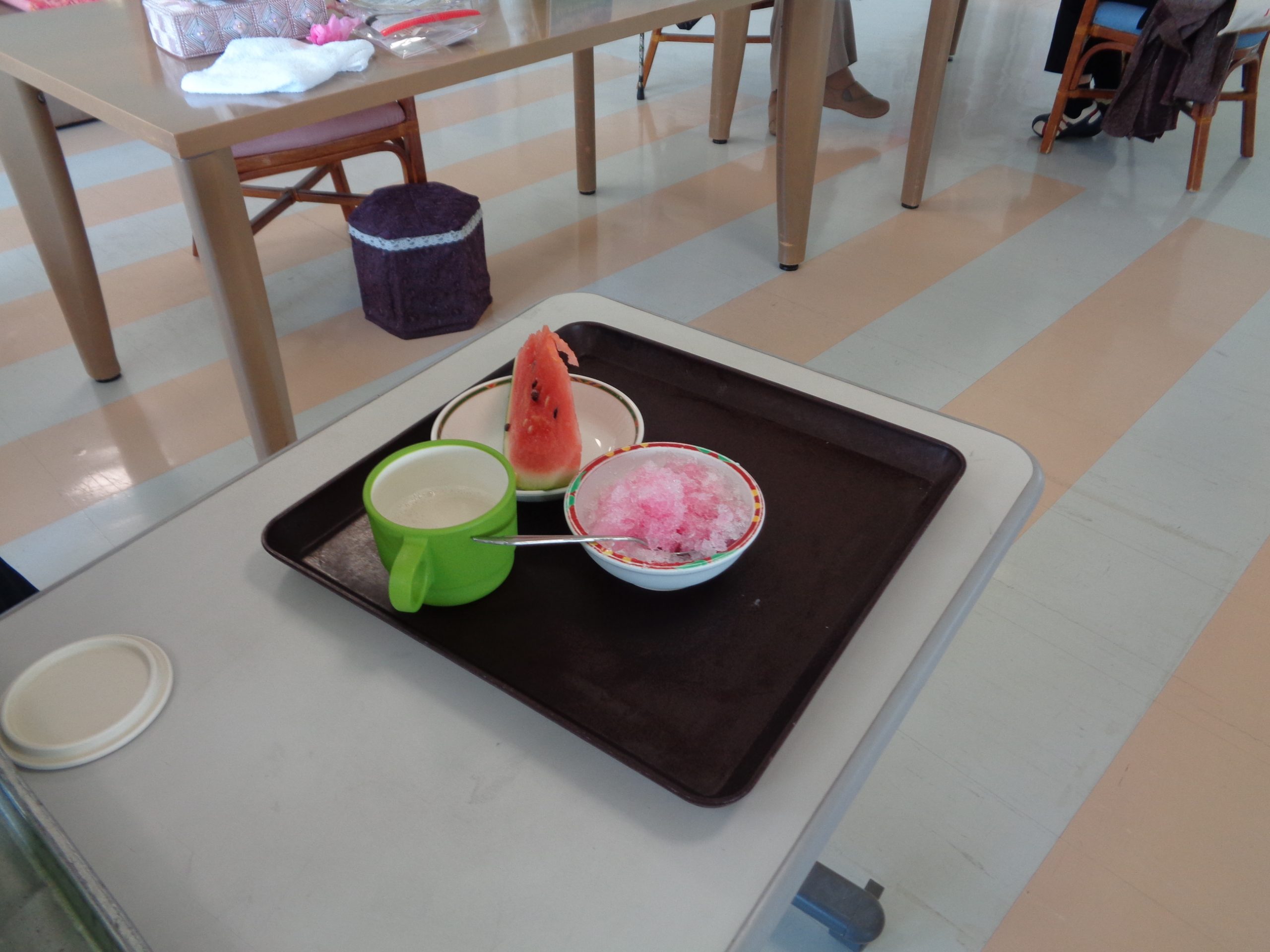 おやつのスイカや甘酒を口にしながら「旬の物を食べるのは良いね」「みんなで食べると美味しいね」と利用者の方からこちらも嬉しくなるような笑顔を見せていただくことができました。