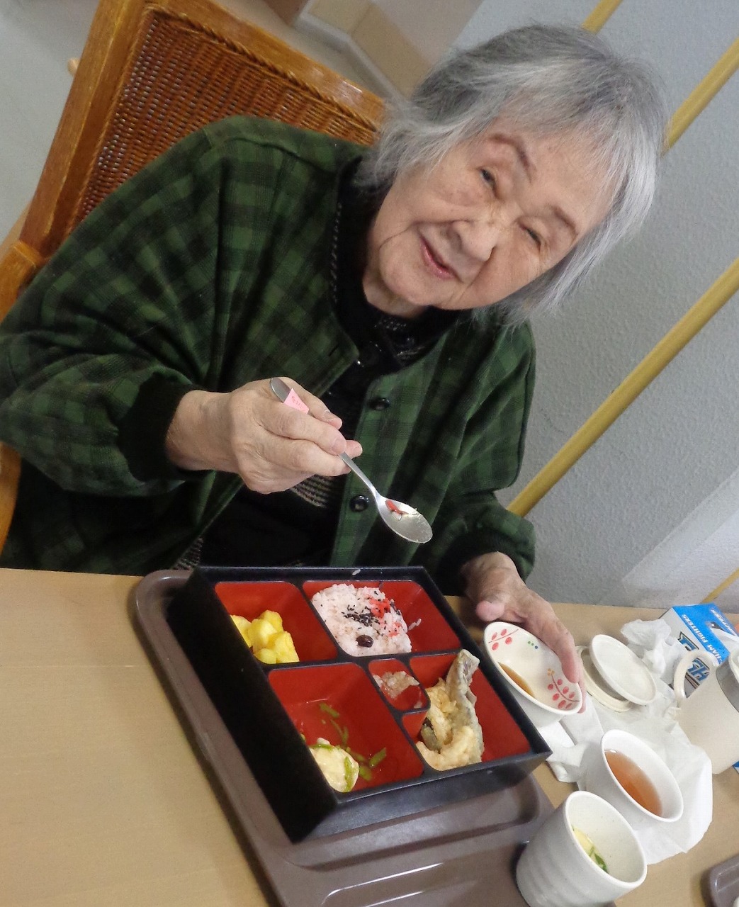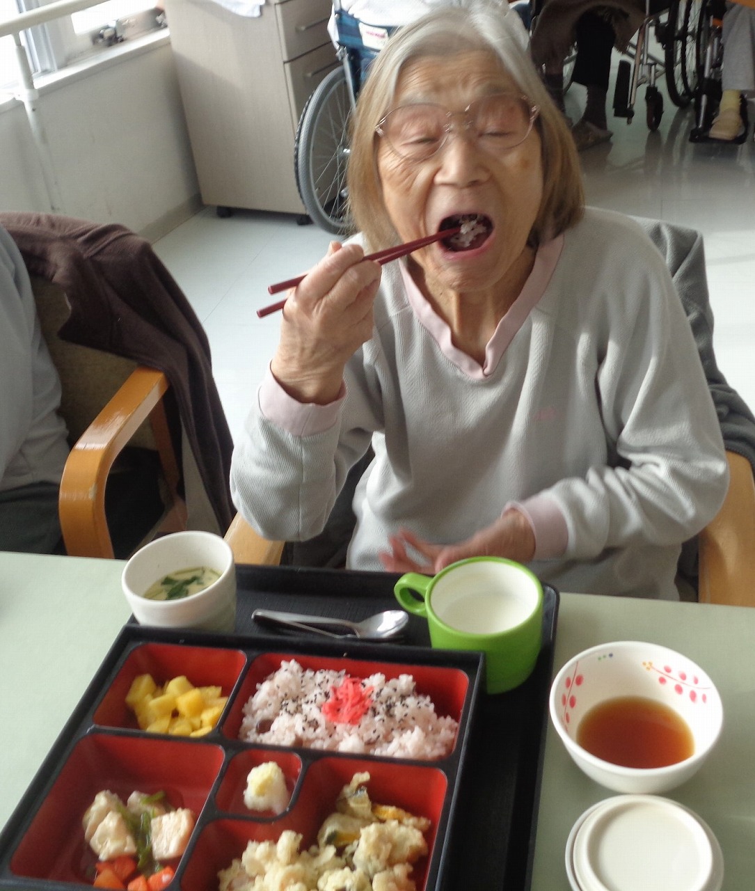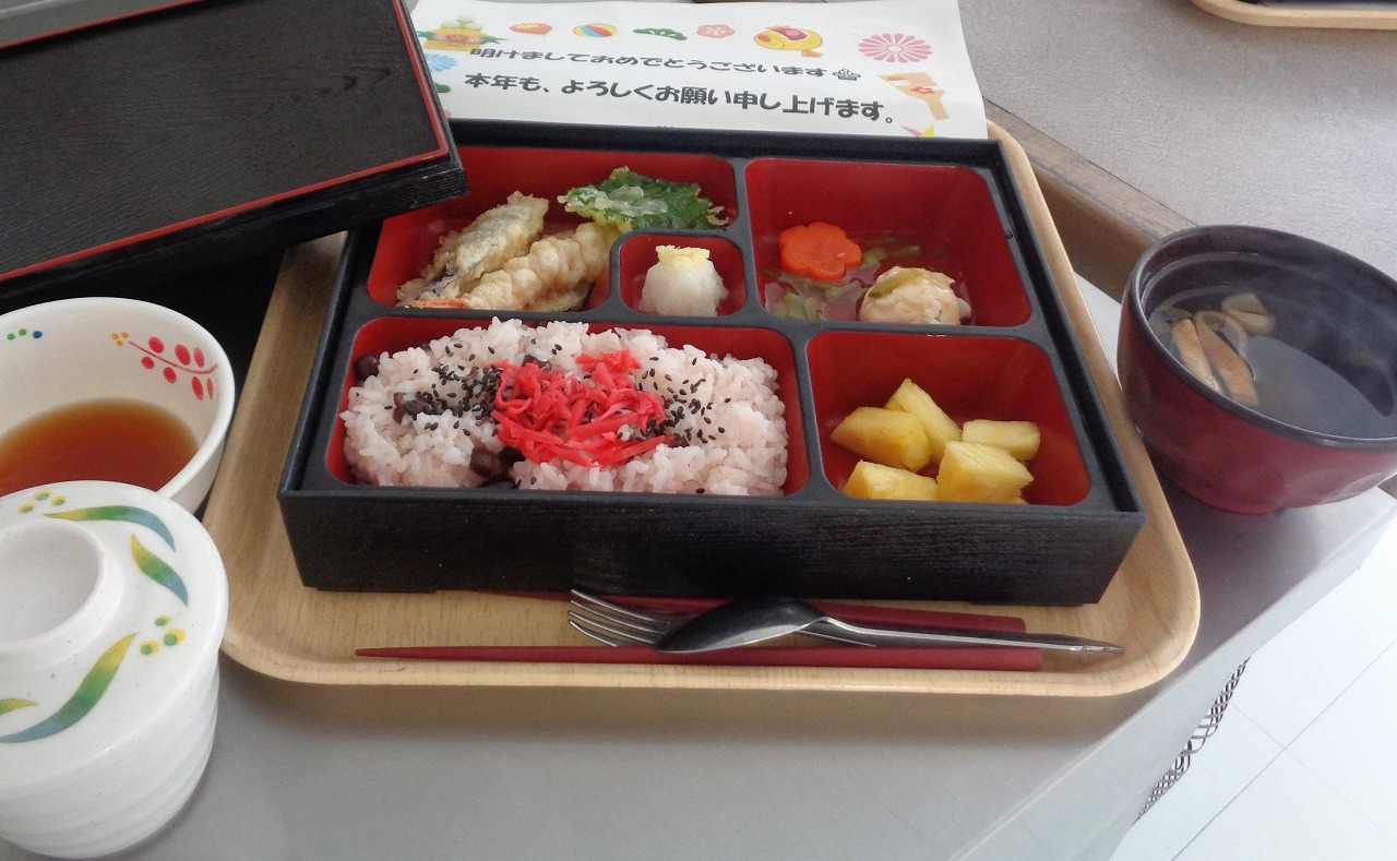 令和3年1月7日(木)、新年を祝う会を行いました。昼食に赤飯、天ぷら、茶わん蒸しの御祝い御膳を頂きました。お祝い御膳は、朝から楽しみにされている方も多く、ダシの香りとほんのり甘い茶わん蒸しは、職員や利用者様皆さんに大変喜ばれる、いつも大人気のメニューなのです。