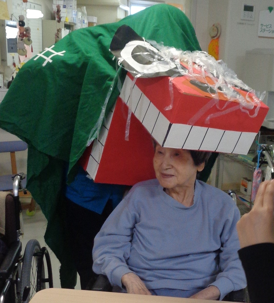 午後からは、手作り神社での初詣や、おみくじ、獅子舞、的あてゲームなど、それぞれの階で工夫を凝らしたレクレーションを行いました。おみくじで当たったお菓子と間食の甘酒を美味しそうにほおばる姿は大変微笑ましく、短い時間ではありましたが、楽しいひと時を過ごされたかと思います。