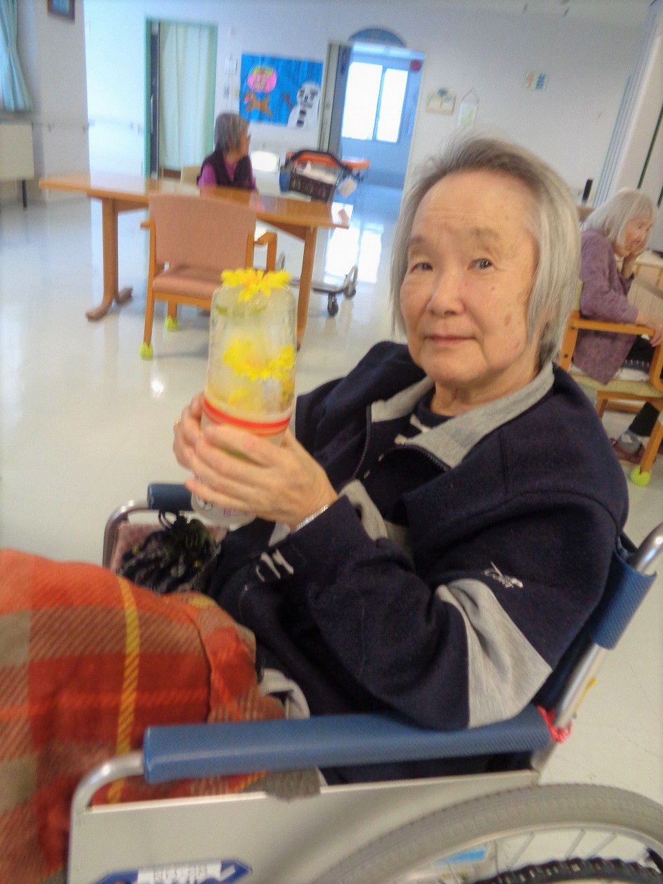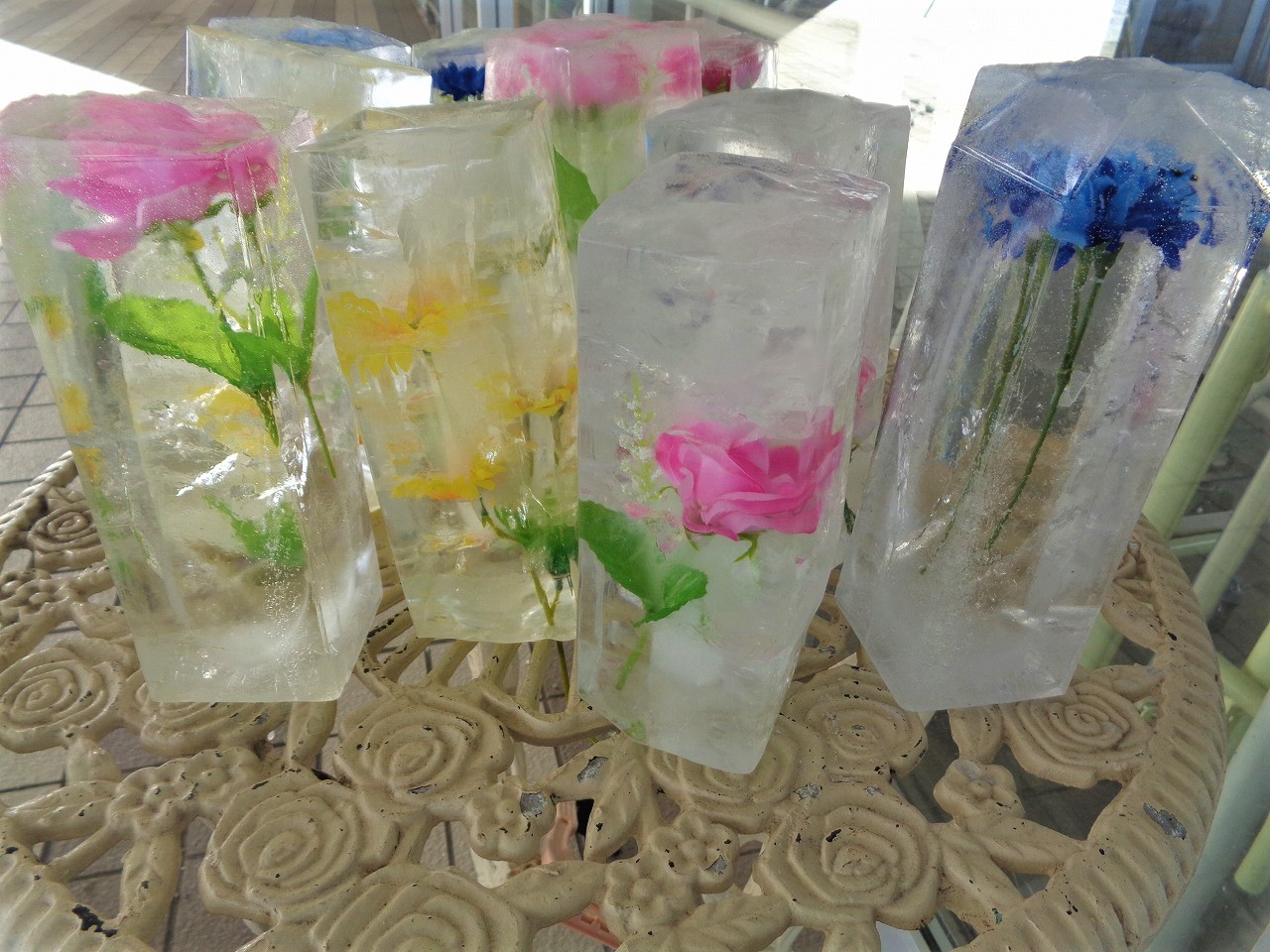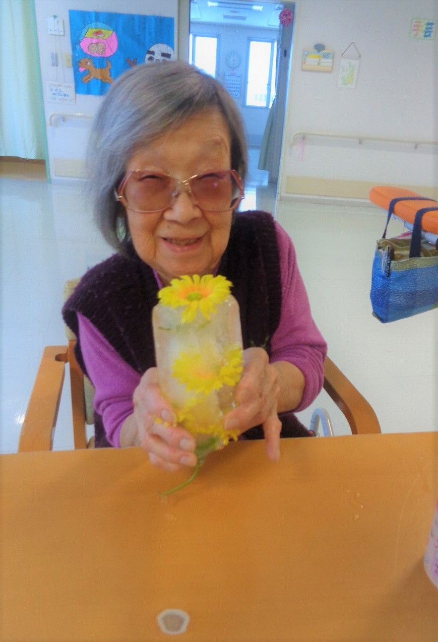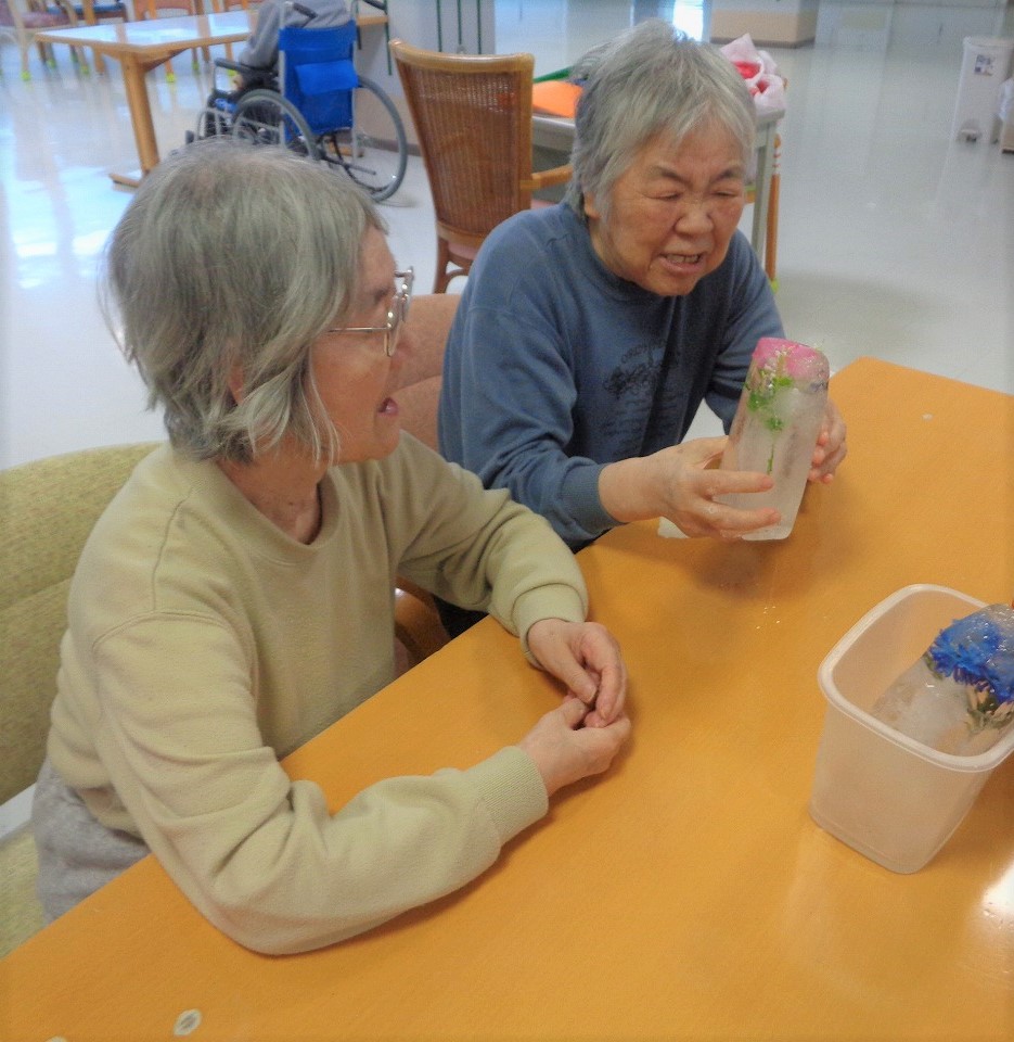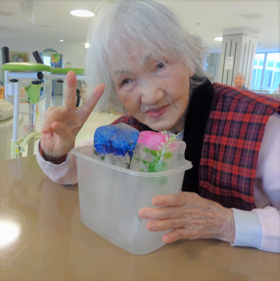 利用者さんには、花の美しさを見て楽しみ、実際に触れることで氷の冷たさを感じていただきました。「とても綺麗!」「冷たいッ!」「なかなか溶けないのね」等様々な感想をいただきました。まさにタイトルにもありますが、『花と氷のアート』といっても過言ではありません(๑•̀ㅁ•́๑)✧ 普段あまり触れることのない氷に触れて、表情も良く、とても楽しそうでした!(^o^)