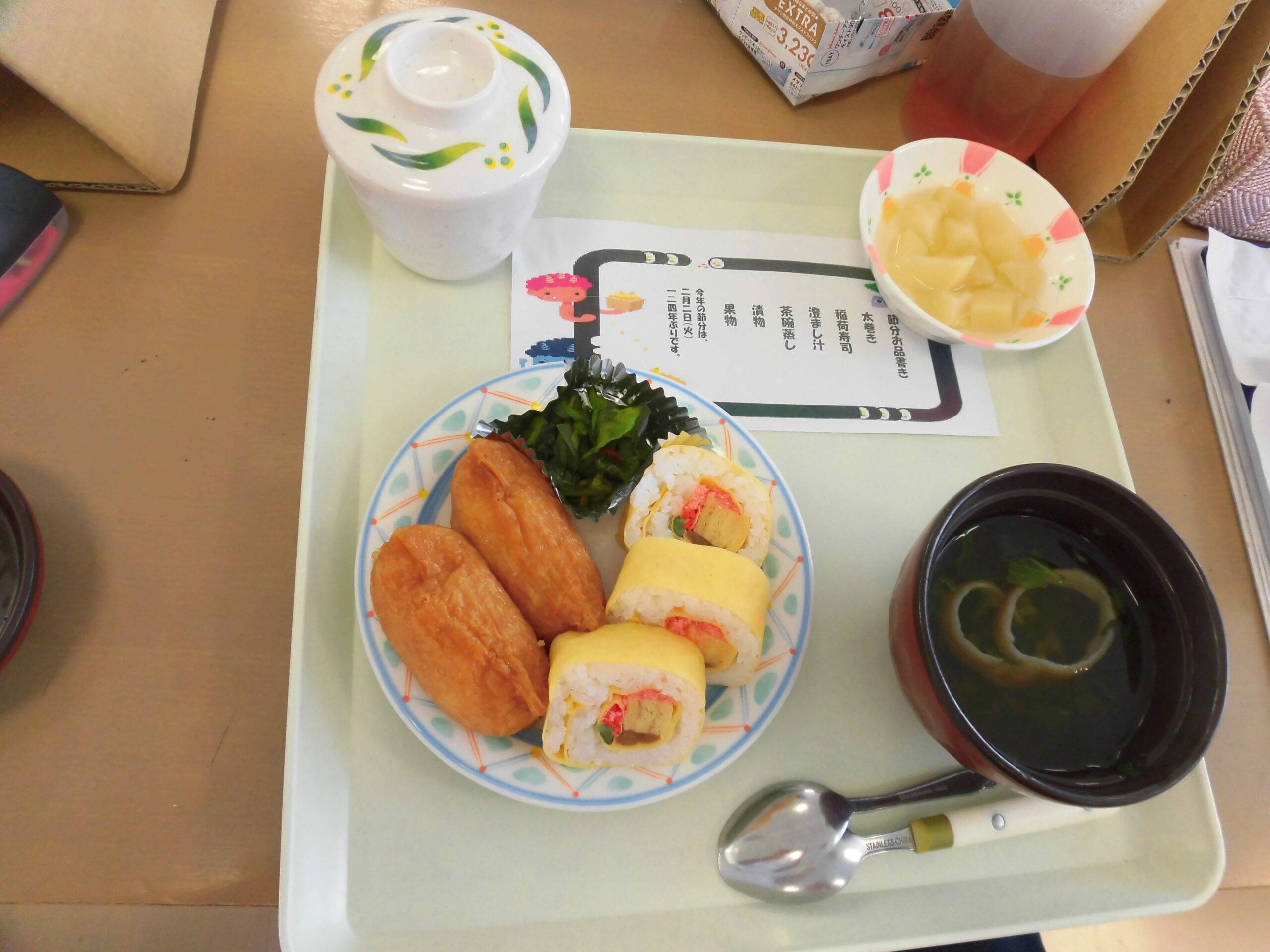 当日の食事は 太巻きと稲荷寿司でした。