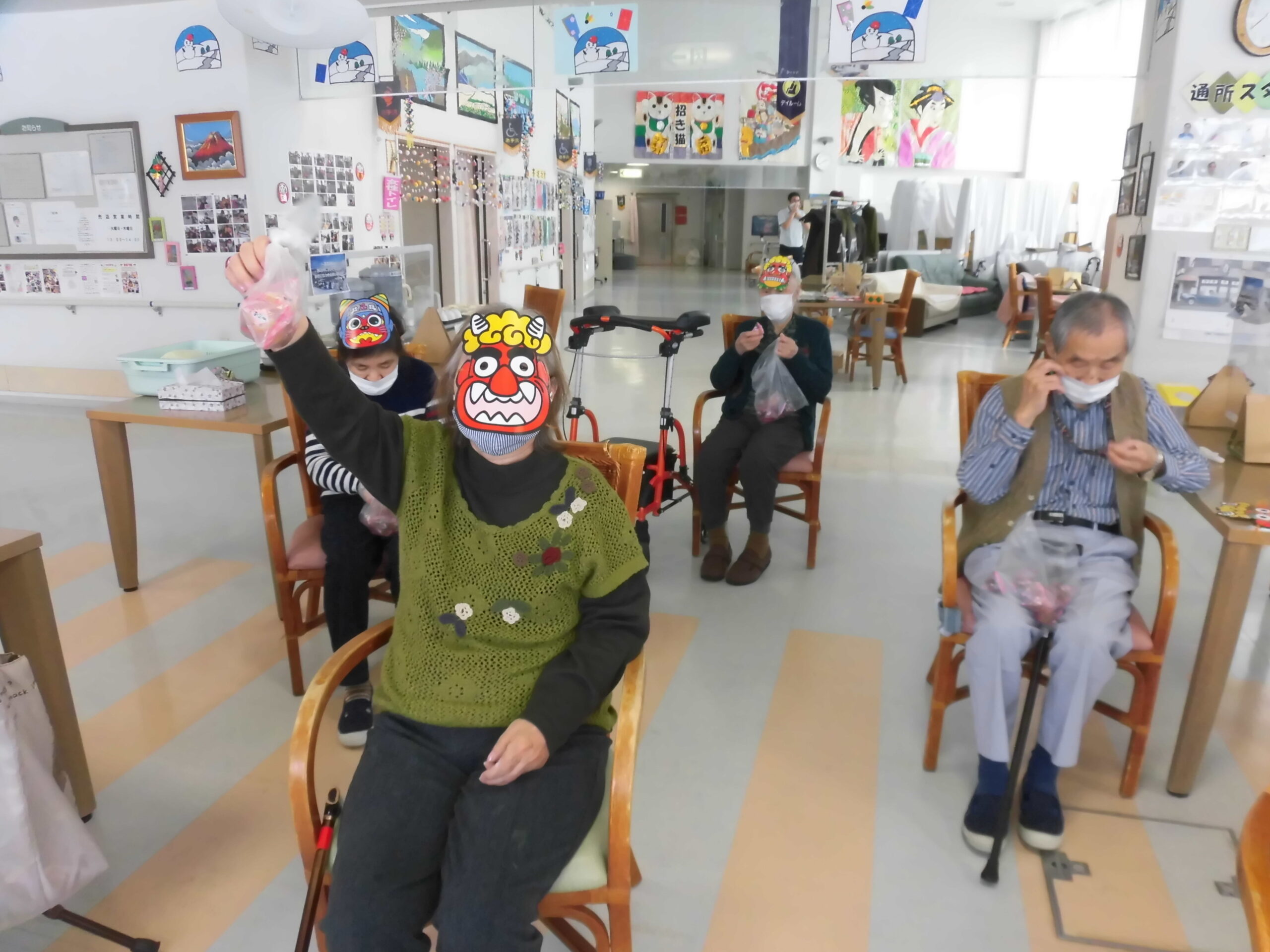 例年 通所では、年男・年女の利用者様が“裃”を付け、各テーブルを回り豆まきをしていました。