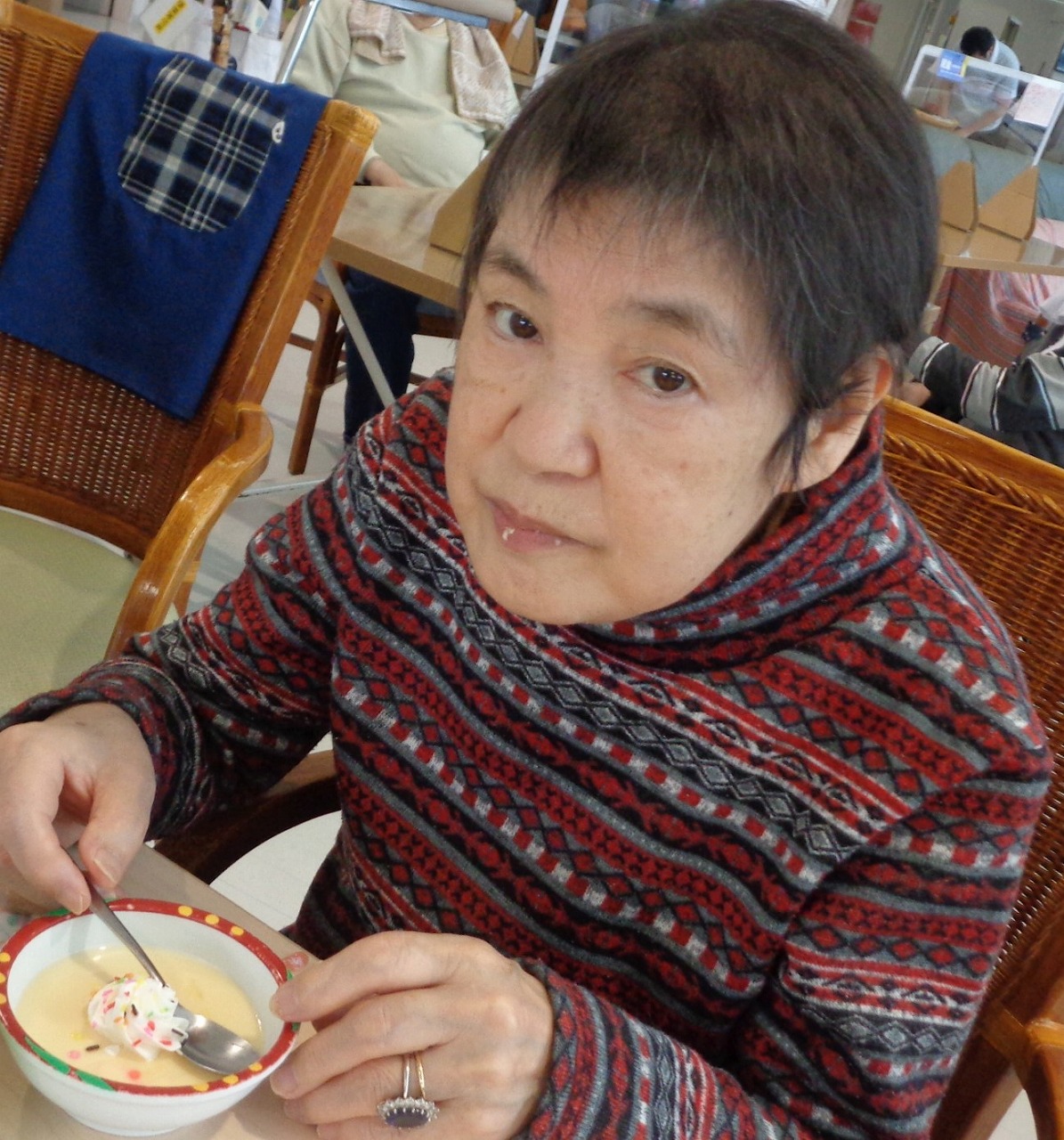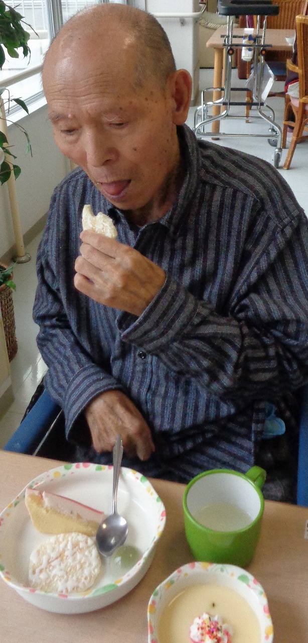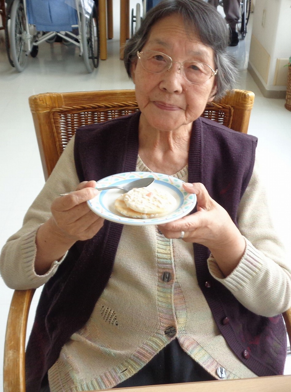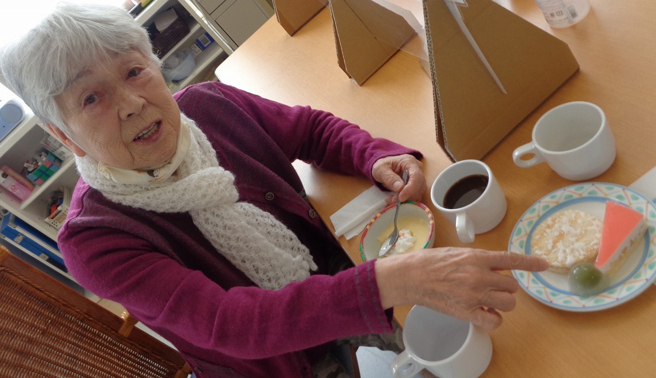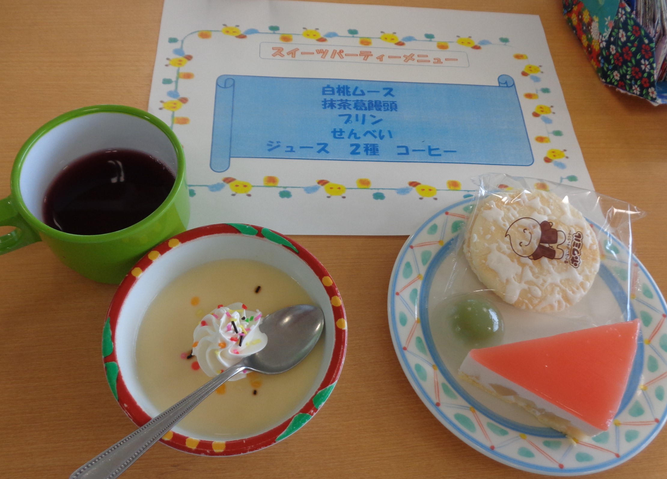 その甘い誘惑に誘われる、スイーツパーティーの季節が、今年もやってきました。毎年、春と秋の年に2回行っています。4月の8日に通所、4月9日は通所と、それぞれの階にて、いつもよりちょっとだけ豪華なおやつを提供しました。今回は、白桃ムースケーキ、抹茶葛饅頭、プリン、せんべいの4種類と飲み物にジュースとコーヒーが付いています。ムースケーキは、桃の果肉も入っていて、噛むたびにホワッと香る桃の香りと、抹茶葛饅頭の色鮮やかな緑に春の訪れを感じます。生クリームとカラースプレーでデコレーションしたプリンは、見た目可愛いらしく、いつもとは違う味わいでした。