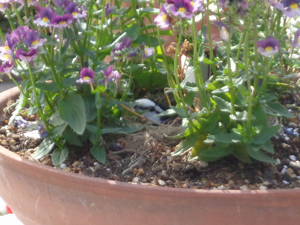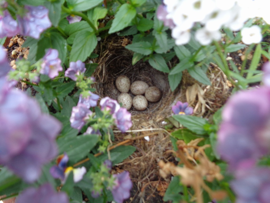 もうひとつ話題なのですが今年もなんと、中庭に私達の家族が帰省して来ました。それは、ハクセキレイです。ここ2年ほどこの時期に中庭にやってきて巣作りをしていたのですが今年もなんと、お花で囲まれた鉢の中に5個の卵を産みました。毎日親鳥が雨の日も卵を温めているその姿はさすが親鳥だなあ-と感心させられました。これからも、ハクセキレイの様子は随時お知らせしようと思っておりますので楽しみにしててくださいね。