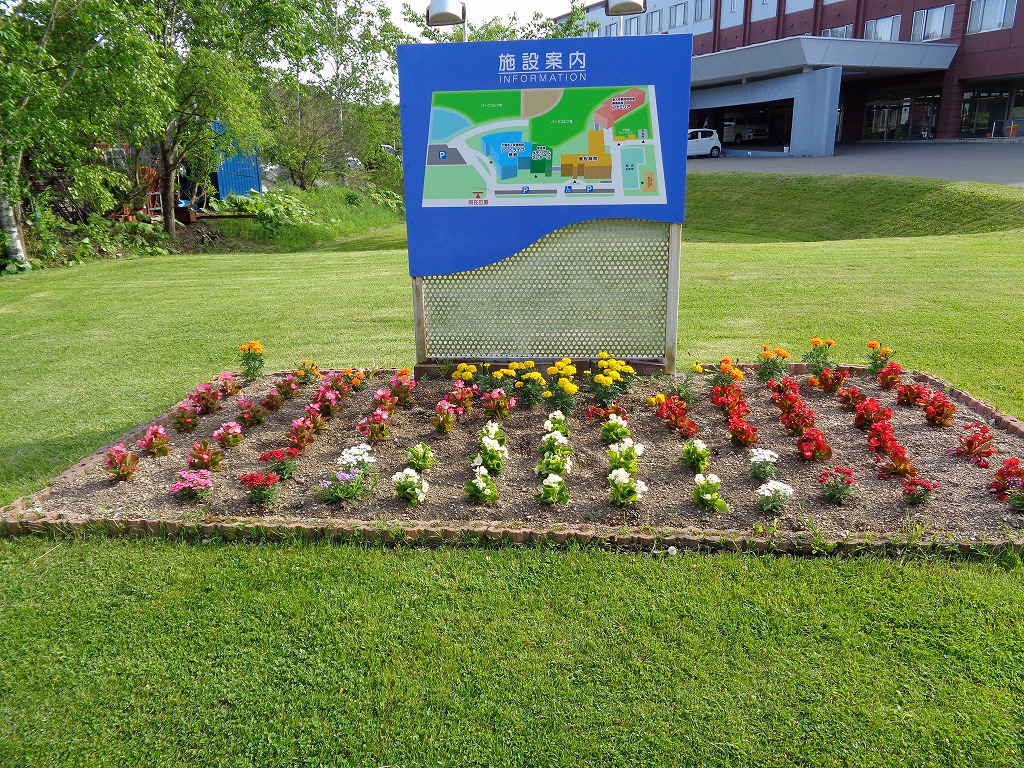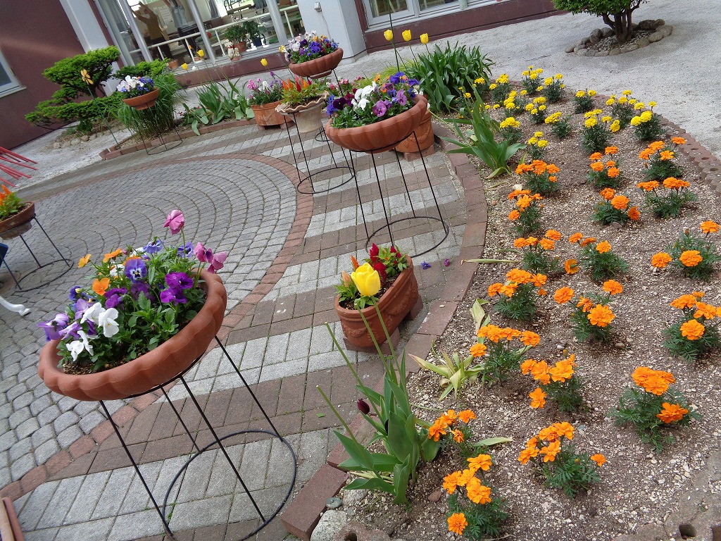 さて、アートライフ恵庭の中庭も6月に入り、チューリップは終わってしまいましたが、今年も、環境美化整備委員会が中心となって5月18日にお花の苗を約180株購入し翌19日に中庭、施設入口看板前に植えました。今年はマリーゴールド、ベコニア、バーベナ、ケイトと、種よりミニひまわり、ナスタジウム、百日草を植えました。植える作業中も、2,3階の利用者様が窓越しに私達にあたたかい眼差しで見守ってくれていたおかげで予定よりも早く作業を終えることができました。利用者様ありがとうございました!