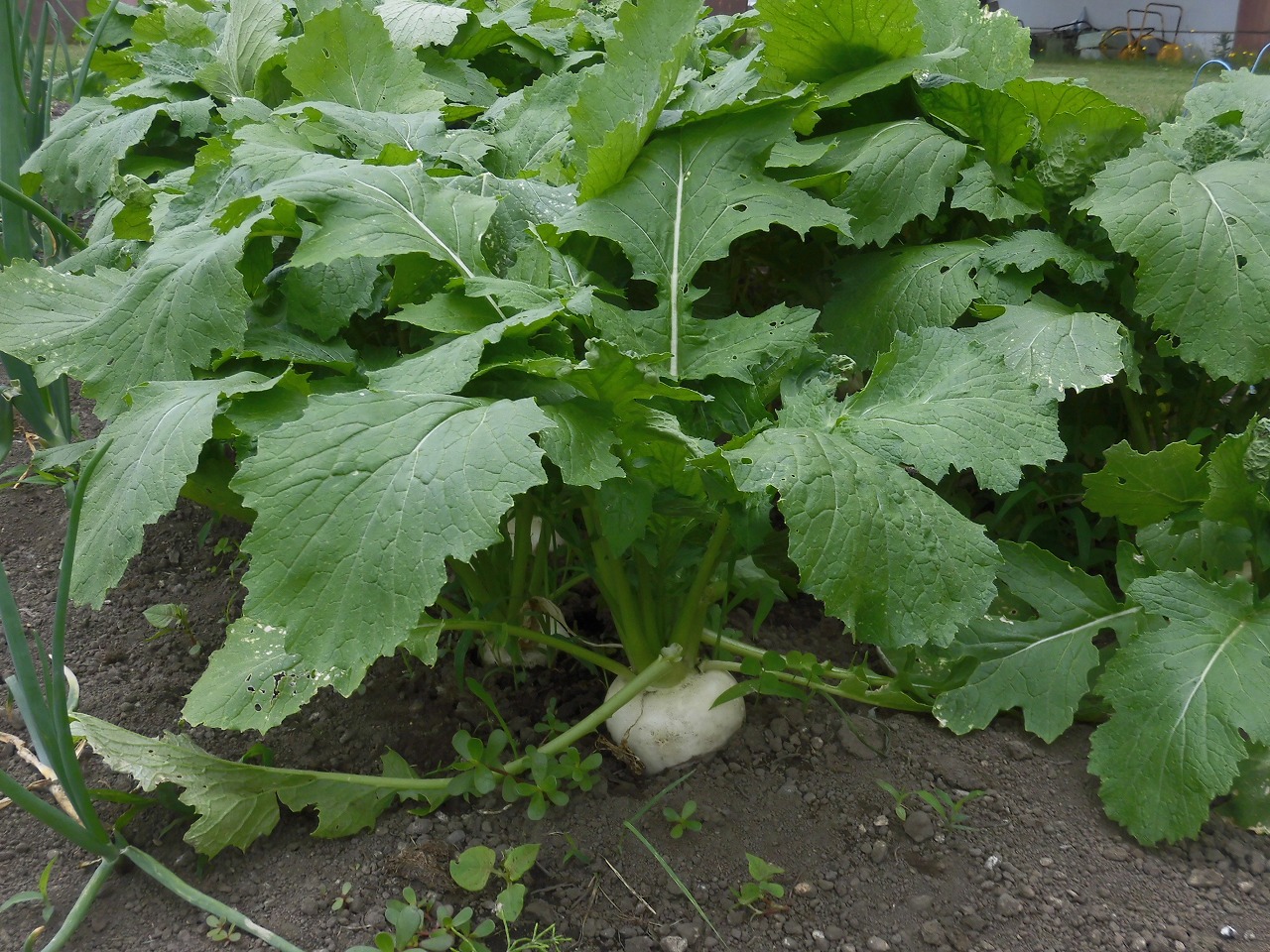 某日、施設管理課の職員が手塩にかけて育てた『カブ』が、大きく育ち収穫時期が来たとの連絡を受けて、長年農家として過ごされてきたご利用者様と一緒に大きく実ったカブの収穫をさせて頂きました。