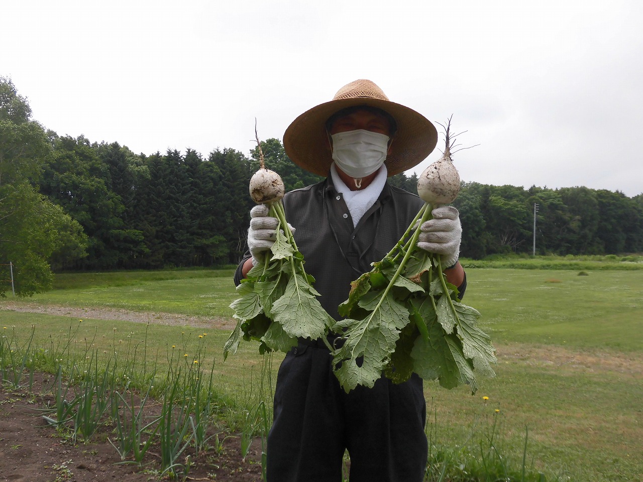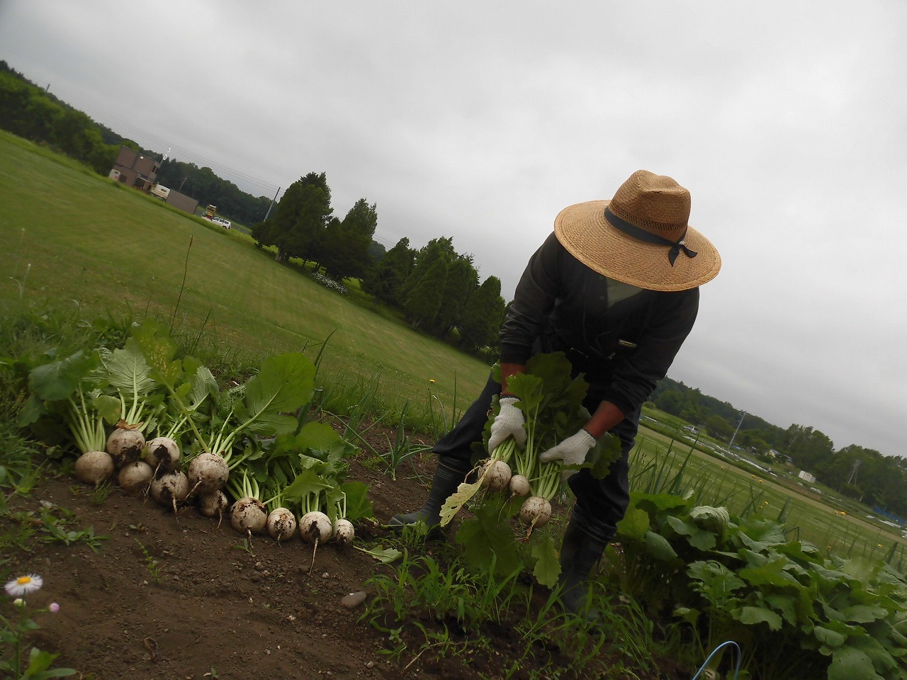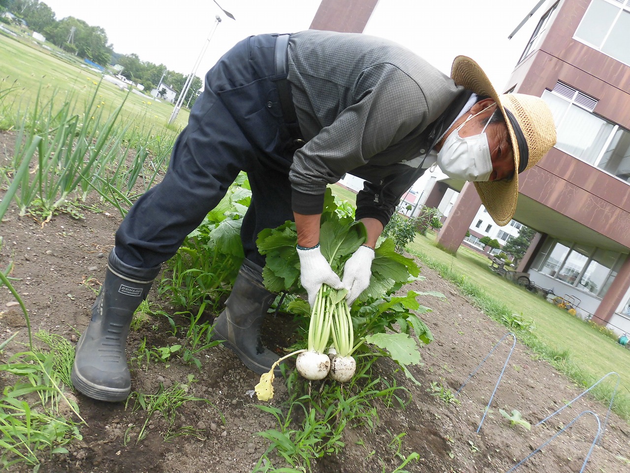 流石!長年されてきたお仕事だけあって、職員が1本ずつカブを抜く中、両手を駆使して4本一気抜き☆という技を用いて、テンポよくカブを抜いていきます。その中で「抜いた後も片付けやすいように葉っぱとカブを同じ方向に向けて抜いて置いていくと良いんだよ。」と、収穫の要領も教えて下さり、当初40分くらいの時間を予定していましたが、ものの15分くらいで抜き終わりました。