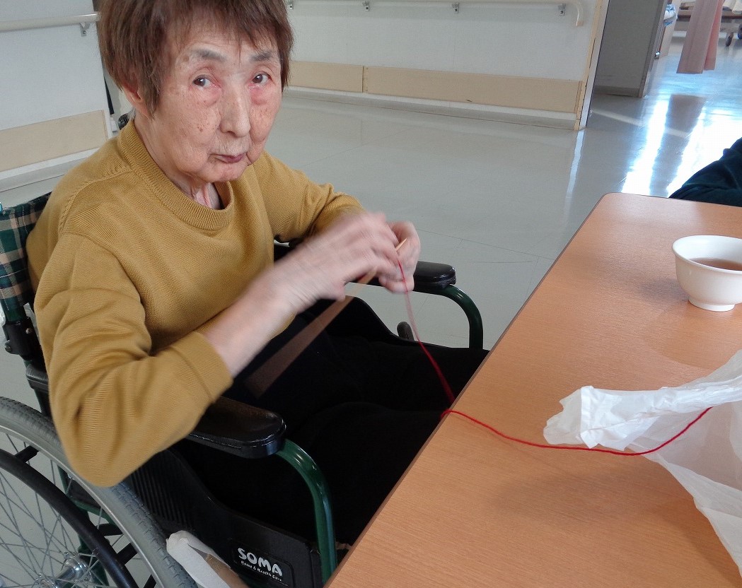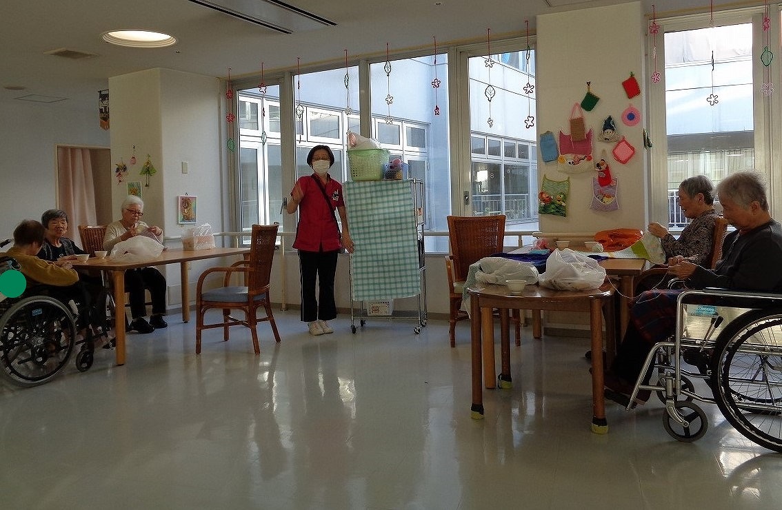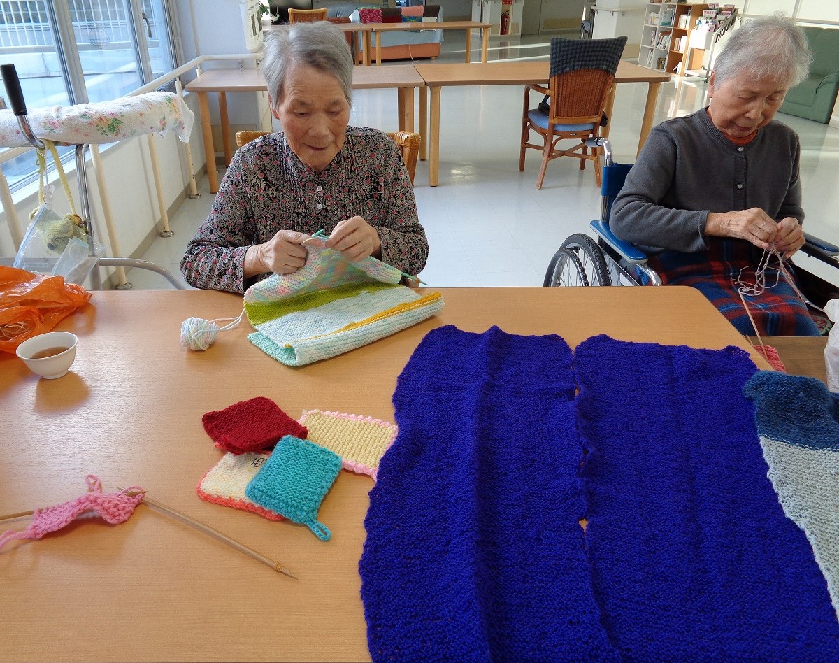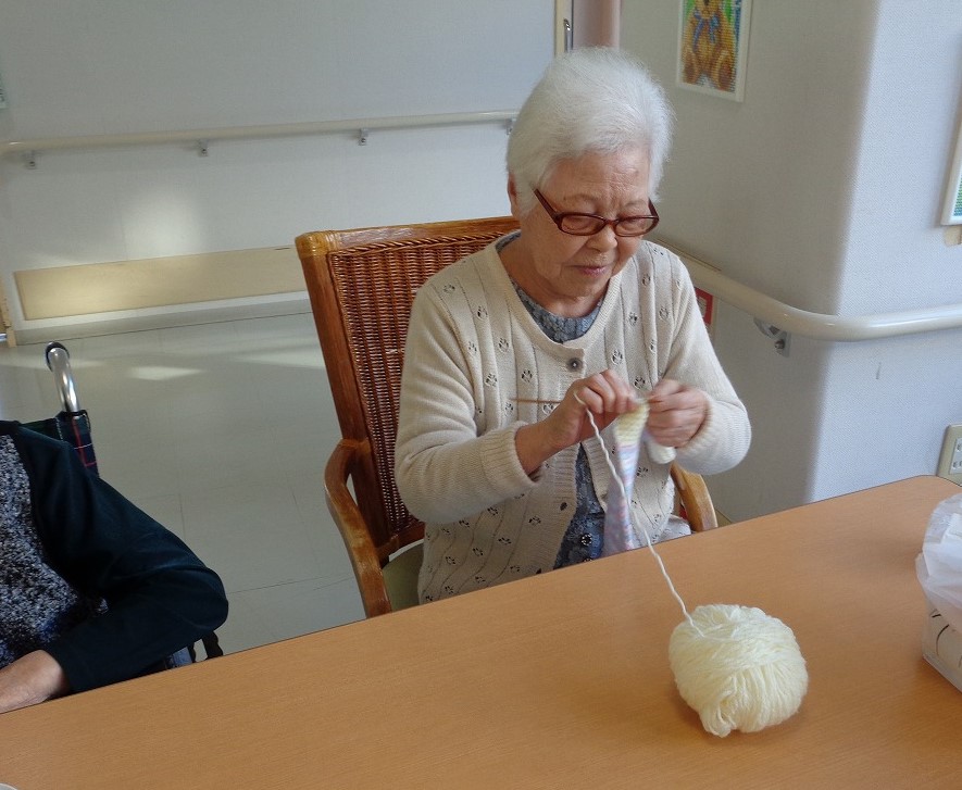 ある利用者様との会話の中で、「寒い時は、毛糸が一番あったかい!」と話題に上がりました。そこで、今回は2階フロアで週1回実施している『編み物クラブ』を紹介したいと思います。