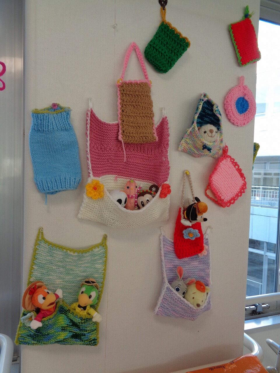 皆さん「昔は、靴下やらセーターやら何でも編んだよ」「私たちくらいの年代なら、みんな編んだもんだよー」等と会話を楽しみながら、それでもしっかりと手元は動かし、着々と作品を作り上げていただいています。小物入れやアクリルたわしの他、大きな物ではひざ掛けやソファーのカバーなど、様々な作品が並んでいますよ♪