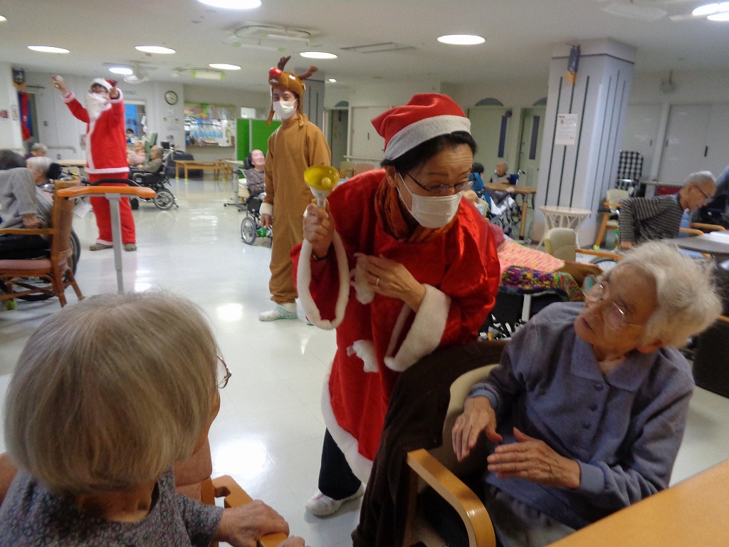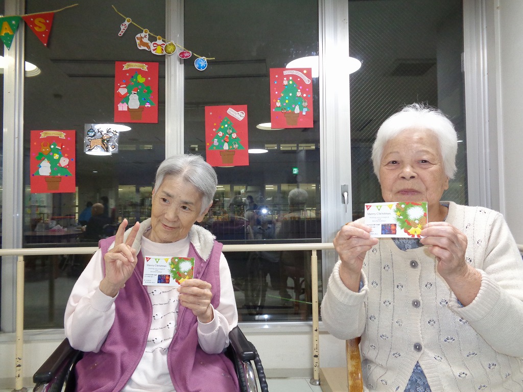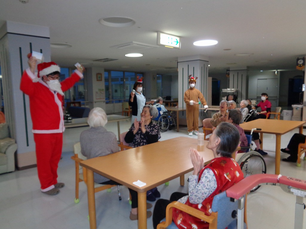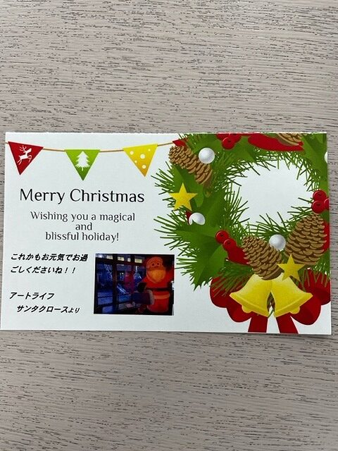 サンタ王国の3人(うち1頭?)からは利用者様にクリスマスカードのプレゼントがありました。皆さん、イルミネーションに負けないキラキラした笑顔になり私達もとても嬉しい気持ちになりました。