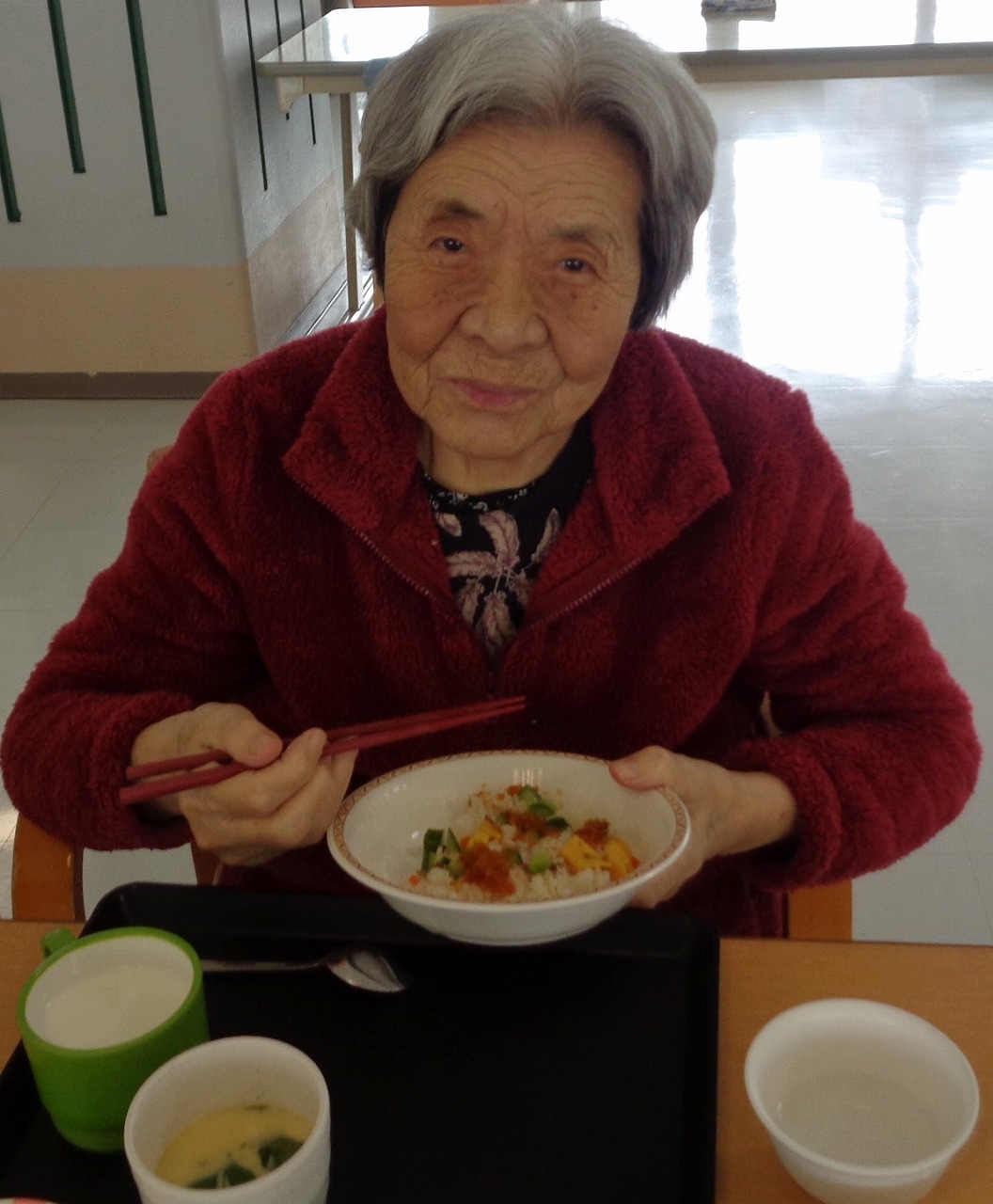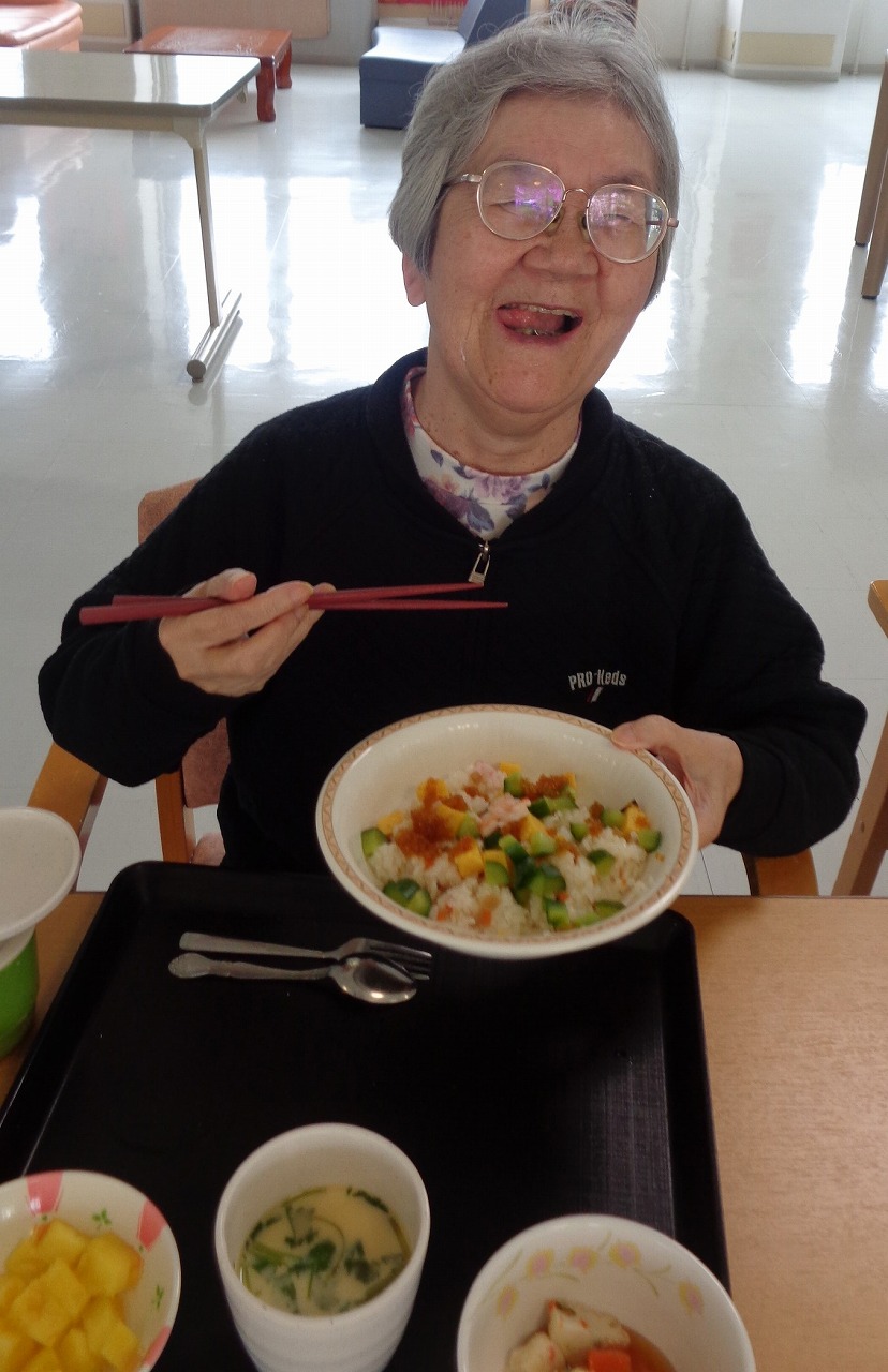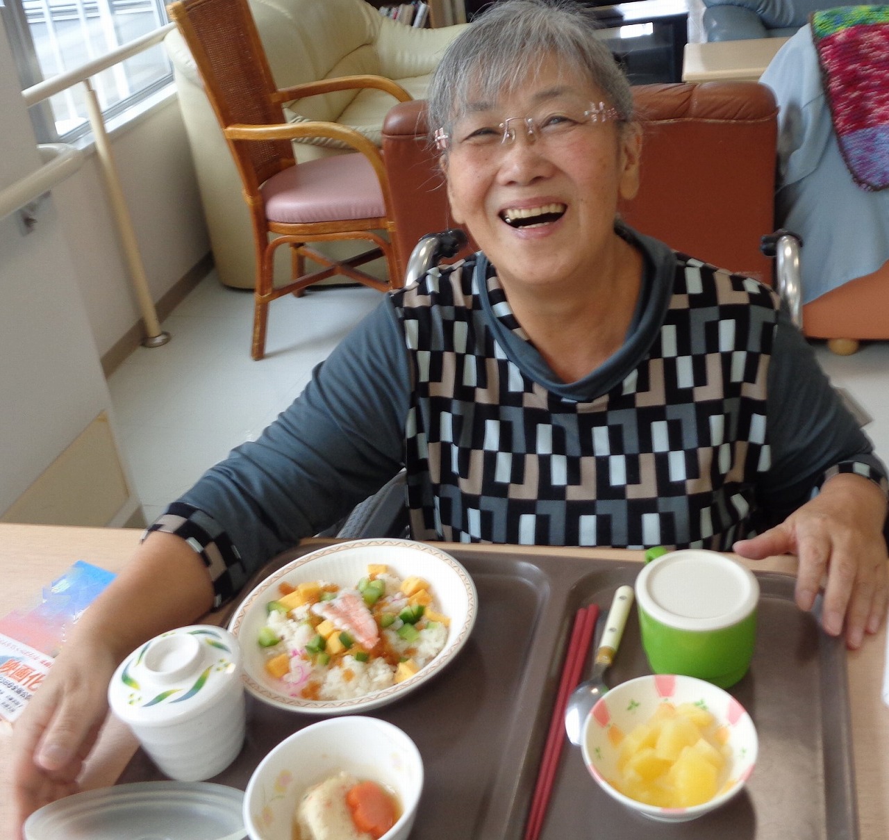色とりどりの食事を見た瞬間、「わぁっ」と喜びの歓声が上がり、美味しそうにモリモリと召し上がる姿、また、茶わん蒸しは、利用者様を始め、職員にも人気があり、その様子を見ているだけで幸せになります。