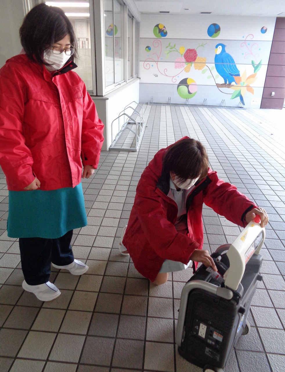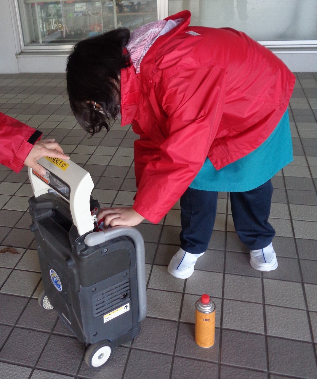 カセット発電機(エネポ)は、手順さえ間違えなければ使用方法は至って簡単なのですが、非常時となると、焦りや、不安が伴います。また暗闇での使用を余儀なくされるかもしれません。いざという時に、使用方法がわからない、機械が動かないということを防ぐために、毎年2回4月と10月に定期点検と新入社員や、使用に不安を感じる方を対象とした訓練を行っています。以前に講習を受けた方でも、発電機を前にすると、「どうだったかな?」と大抵の人は固まります。動作の再確認は常に必要なのだなと改めて思いました。